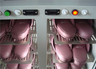 院内用スリッパは、ボックスの中で紫外線とオゾンにより、清潔に消毒保管されています。スリッパは、抗菌素材のものを使用しています。