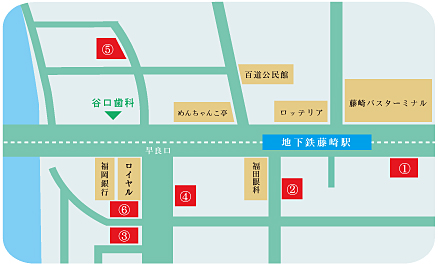 ◆アクセス 福岡市早良区百道2-9-2 地下鉄「藤崎駅」2番出口より徒歩2分 ◆駐車場のご案内 道路拡張に伴い医院前の駐車場が停めづらくなっております。車でご来院の皆様にはご迷惑をおかけしますが、近くのコインパーキング、一時駐車場のご利用をお願いいたします。 (1)藤崎中央パーキング (2)タイムパーク藤崎1丁目 (3)弥生1丁目パーキング (4)藤崎1丁目パーキング (5)日本パーク百道2丁目パーキング (6)G・L・Sパーキング ![]() (1)をご利用の場合 駐車券を受付にご提示ください。 治療費精算時に料金をお渡ししています。 (300円を限度として) (1)以外をご利用の場合 領収書をお取りいただき、次回ご来院時に受付にご提示ください。 治療費精算時に料金をお渡ししています。(300円を限度として) |
